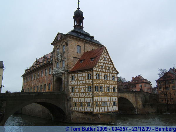 The old Town Hall perched on the edge of the Regnitz river
