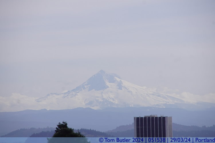 Mount Hood and top of a skyscraper